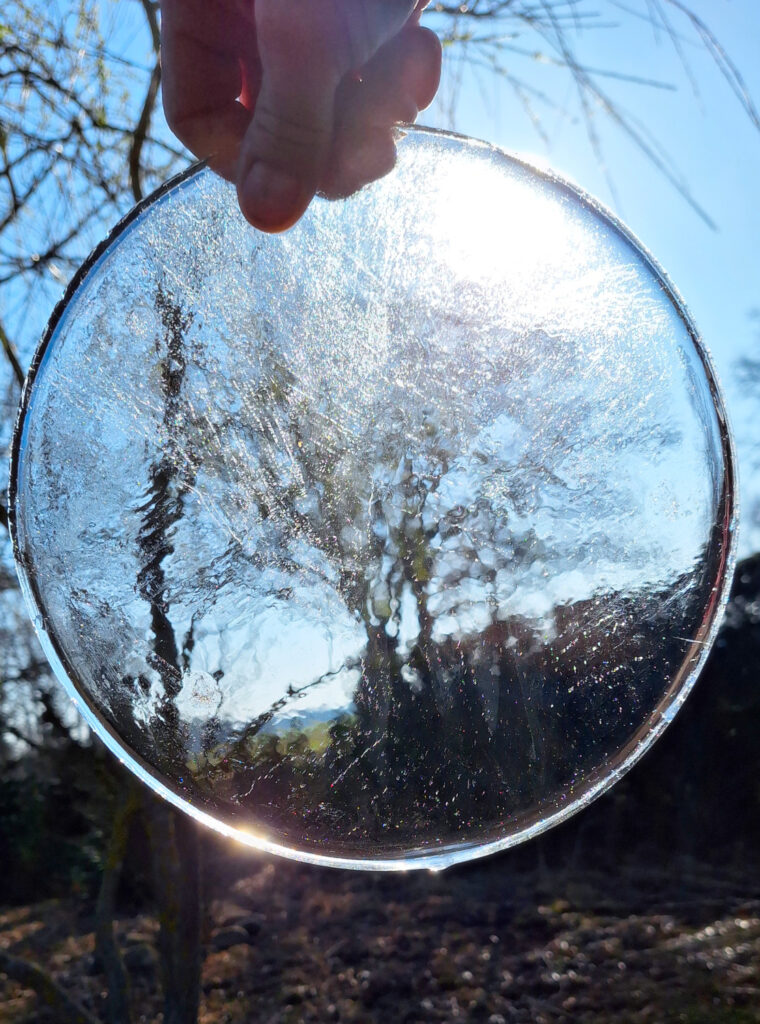 Sonne und Eis: Eine Scheibe aus Eis aus der Hühnertränke im Außengehege. Trotz der ersten warmen Sonnenstrahlen ist der Nachtfrost noch ein ständiger Begleiter.
