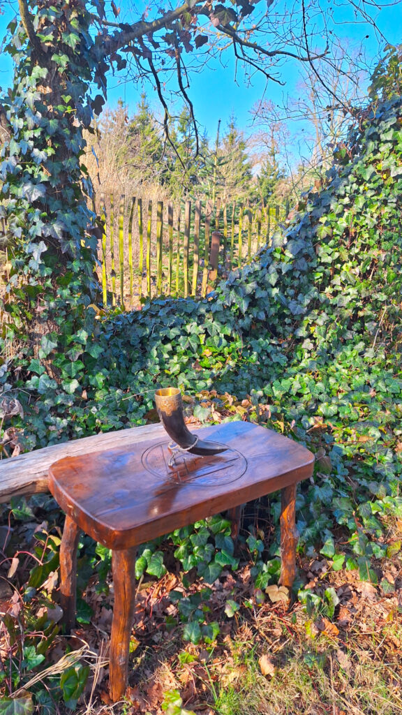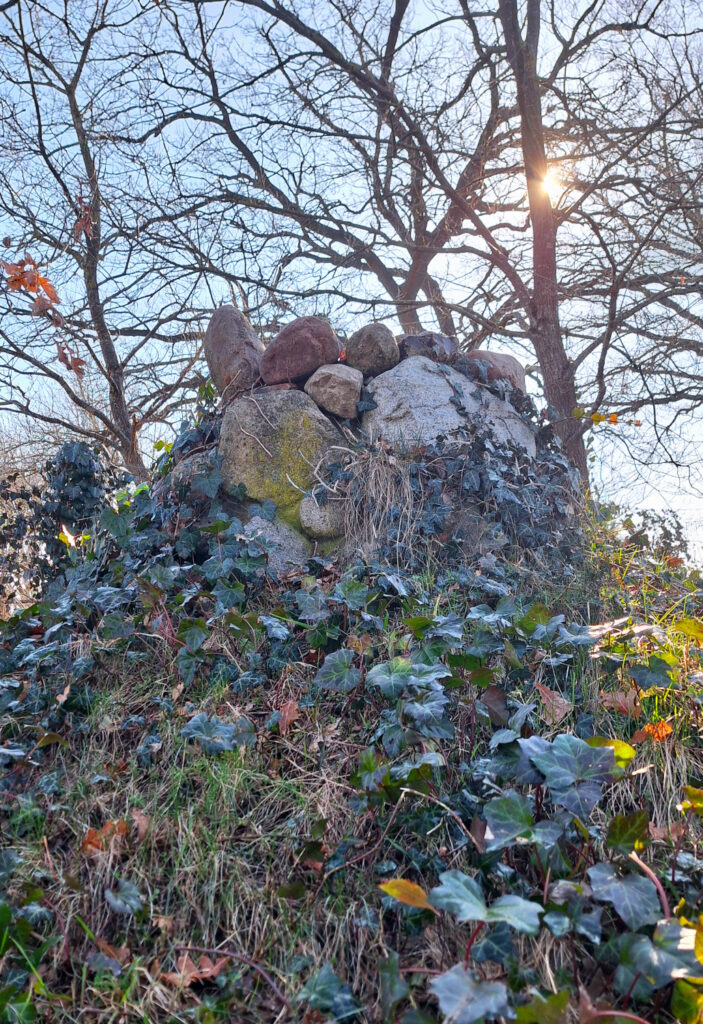 Hörgr aus Steinen mit Efeu im Morgenlicht